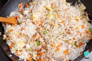 El arroz frito se puede preparar con antelación y refrigerar. Sin embargo, es mejor preparar la tortilla justo antes de servir para mantener su textura suave y esponjosa.